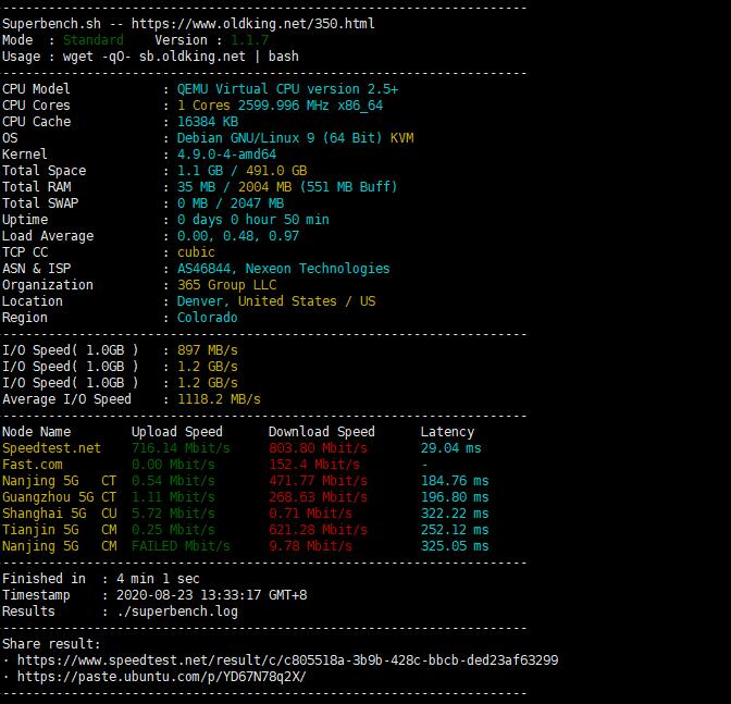 总结:IO还行,CPU性能超强(有误,是系统模板问题,换centos后变成正常分数,实际分数700左右),网络挺渣的,G口,流量不多